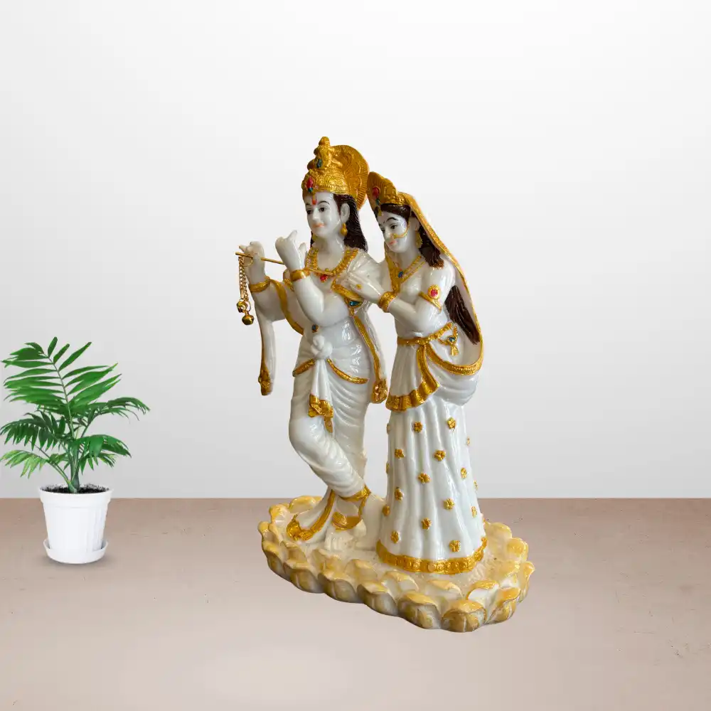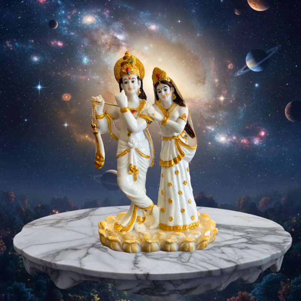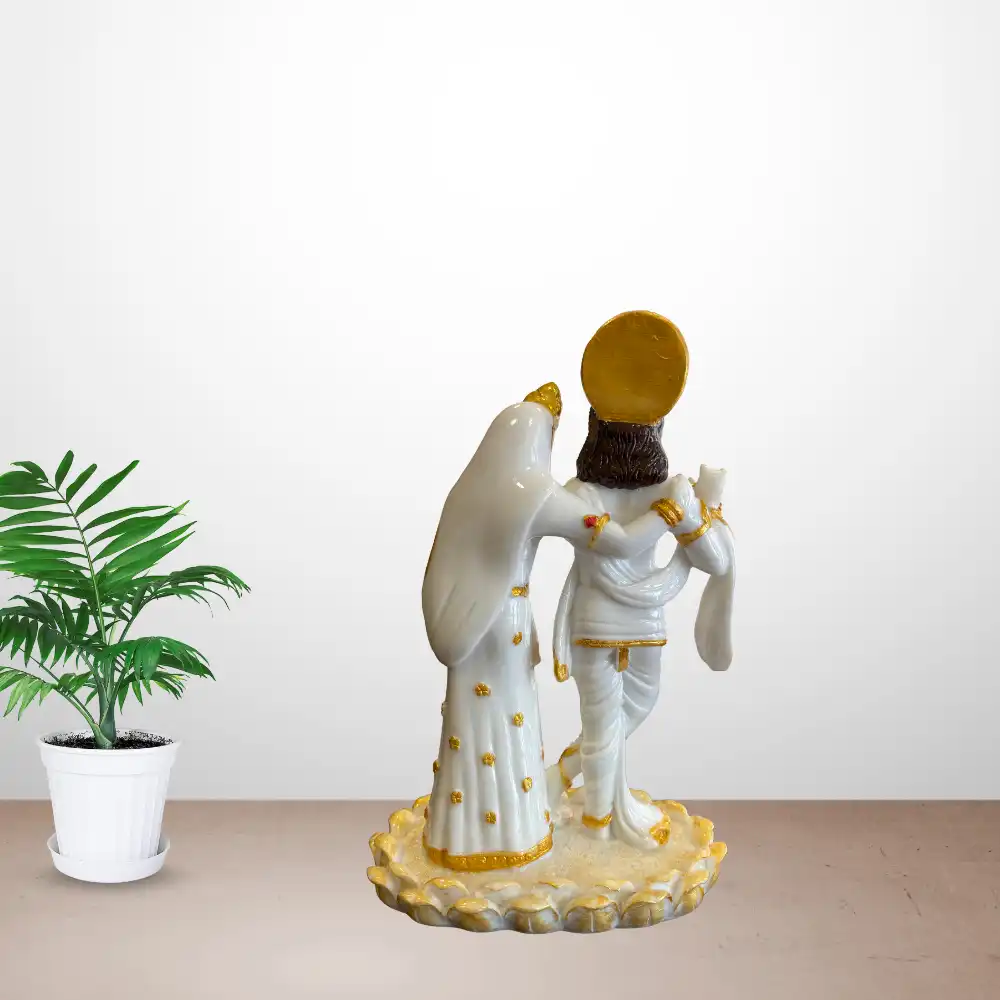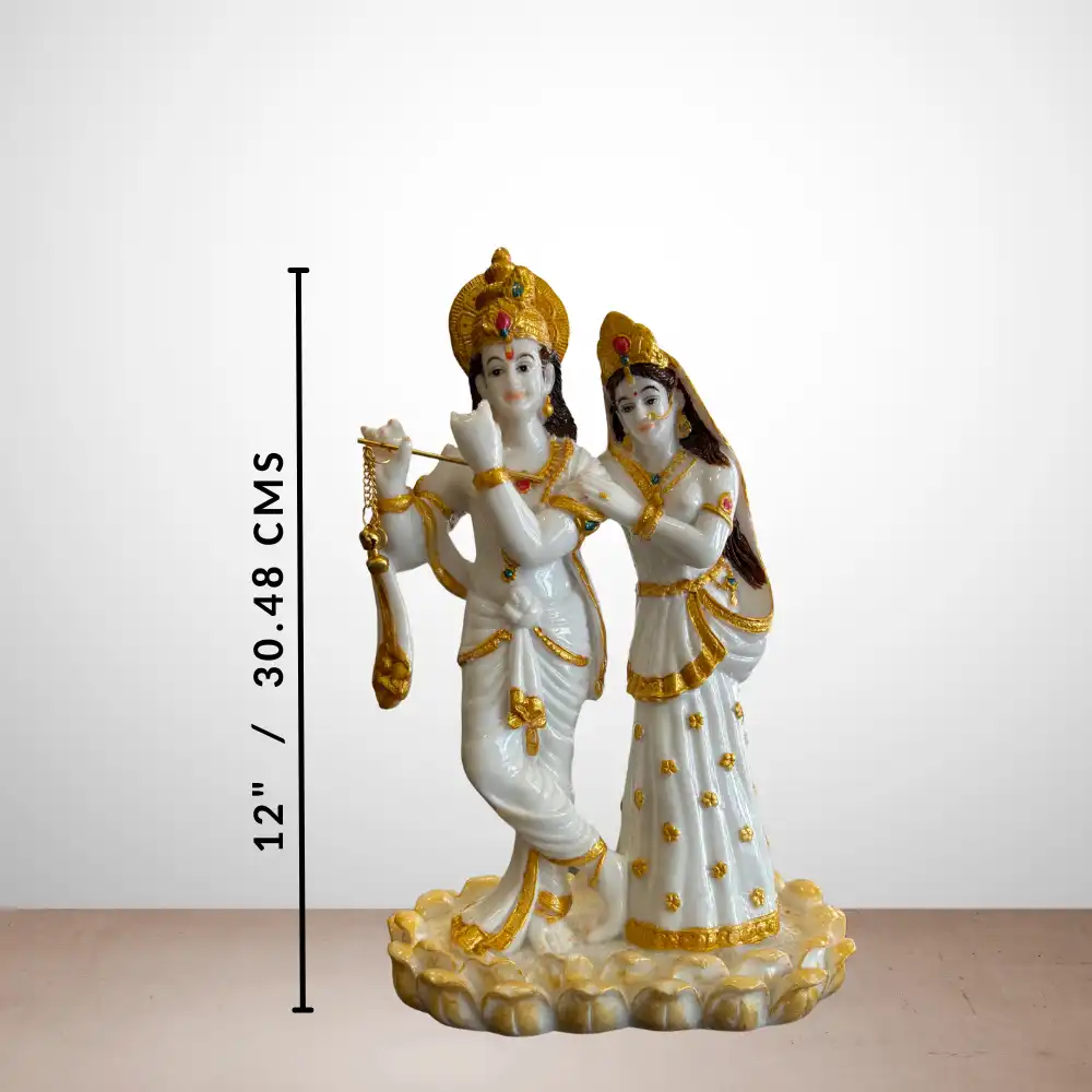 Elevate the spiritual ambience of your home with this 12-inch Radha Krishna idol. Krishna is depicted in a musical flute pose while Radha stands beside him, representing love, devotion, and harmony. The fine craftsmanship and polished finish make it a beautiful addition to home temples, decorative spaces, or as a meaningful gift for special occasions.