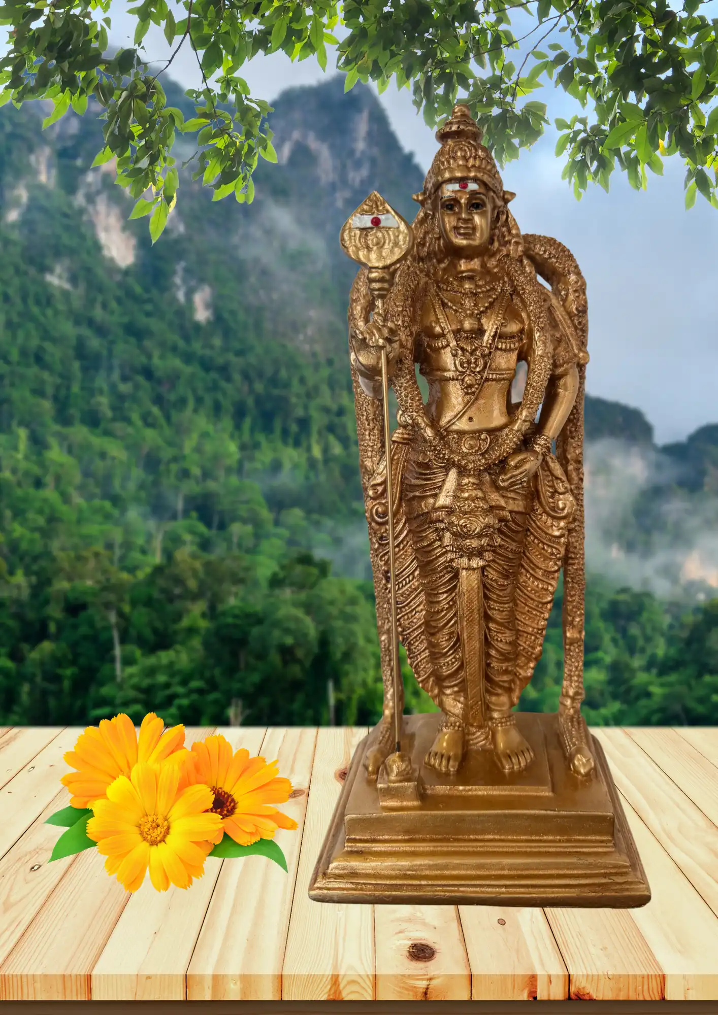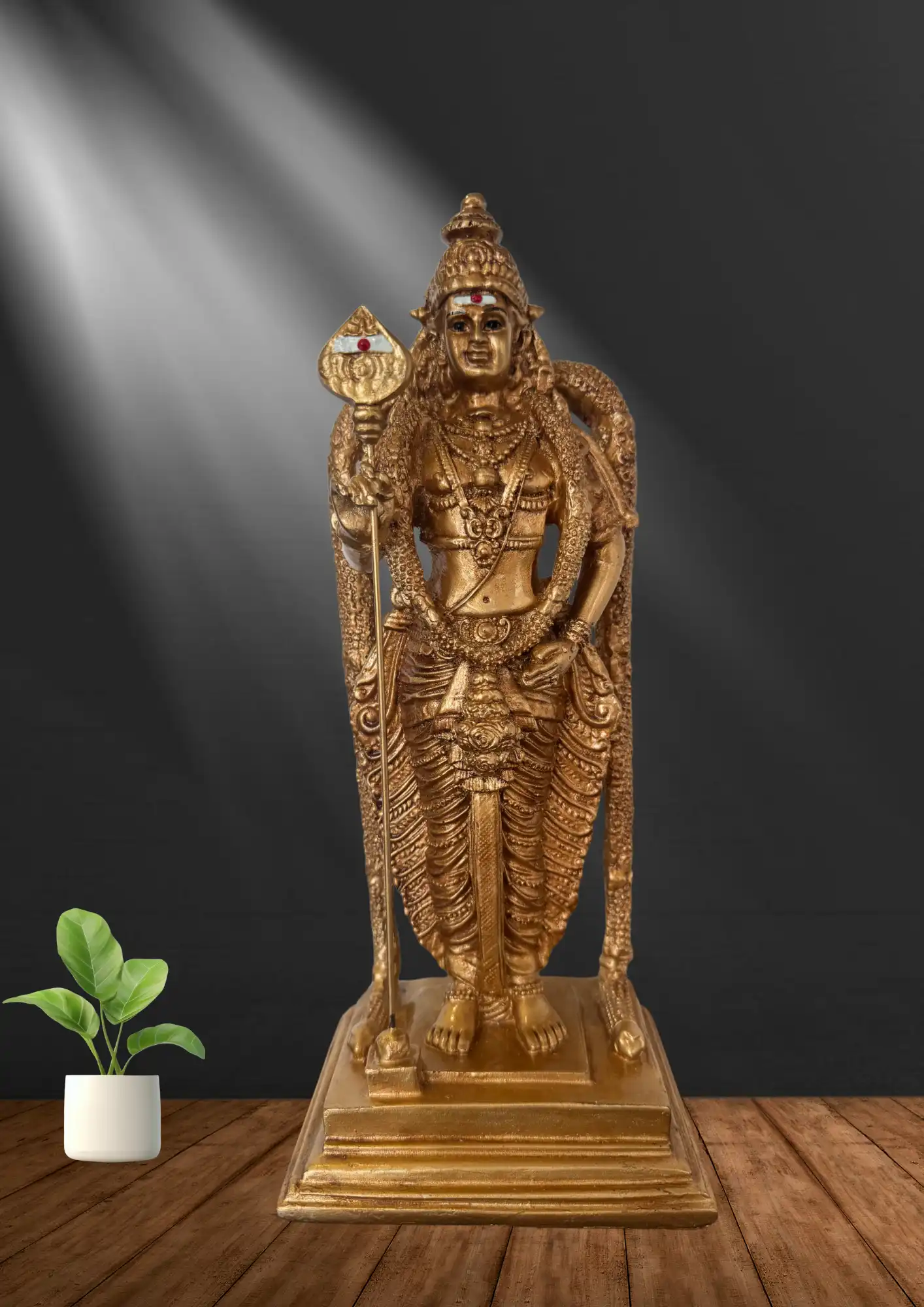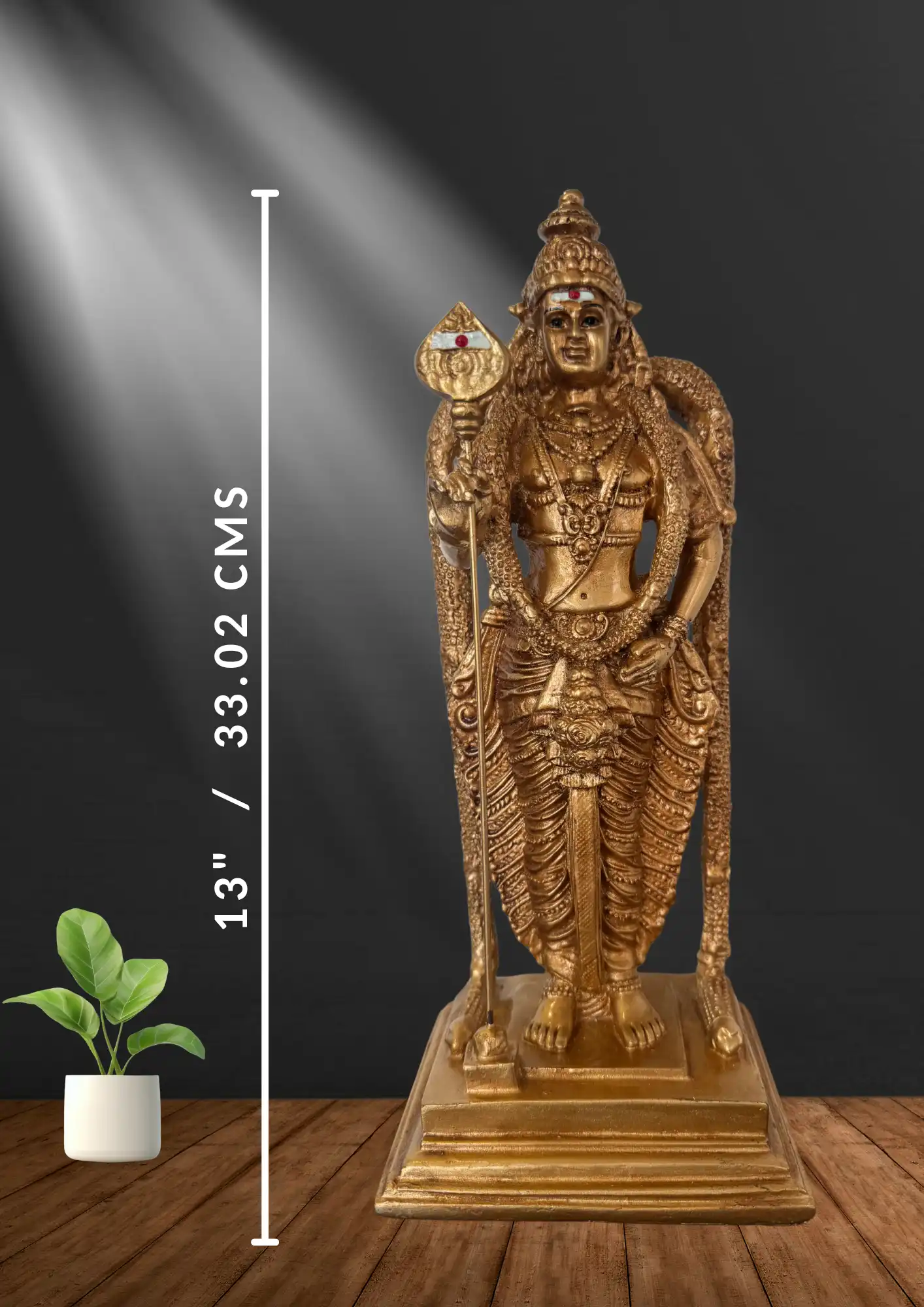 This 13-inch Lord Murugan idol, crafted from marble dust and adorned with a golden finish, embodies divine strength, protection, and wisdom. Its intricate hand-painted details showcase expert craftsmanship, making it a striking centerpiece for home temples, offices, or spiritual décor.