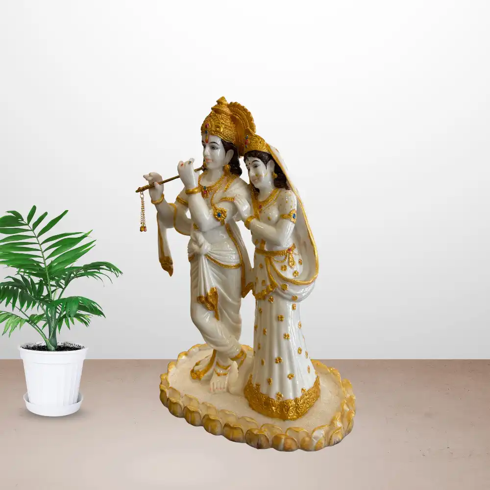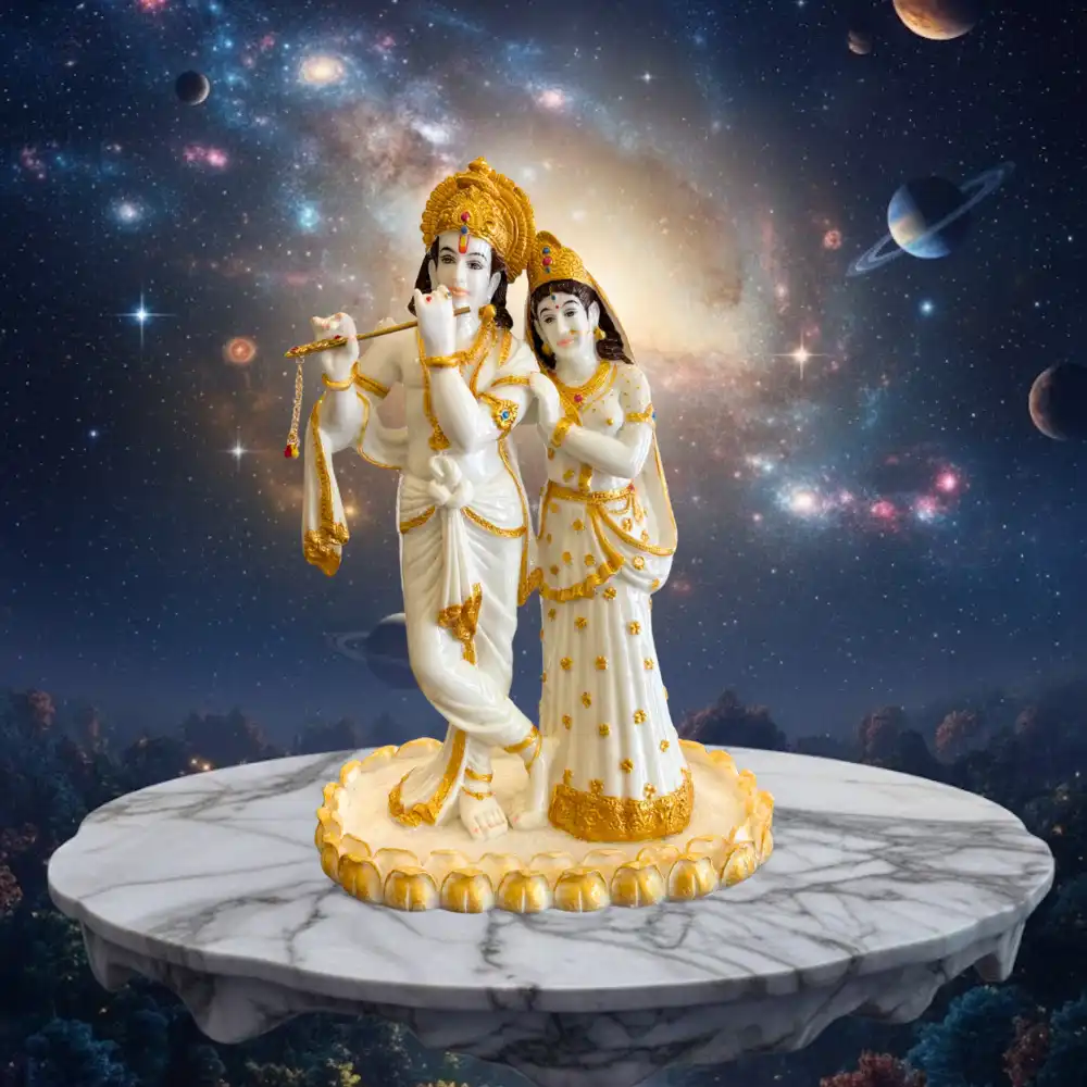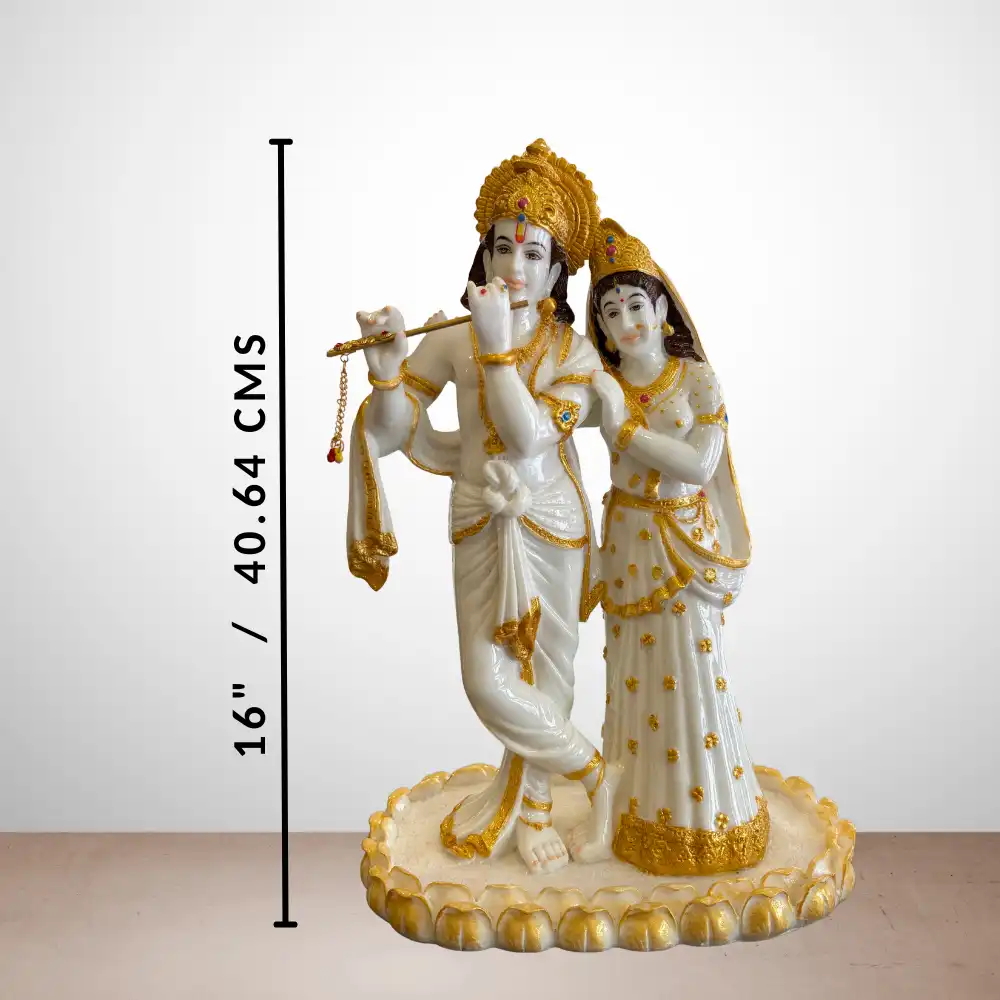 Celebrate devotion and harmony with this 16-inch Radha Krishna idol. Krishna is depicted playing his flute while Radha stands beside him, symbolizing eternal love and spiritual connection. Crafted with intricate details and accented with gold, this statue exudes elegance and divine charm. Ideal for home temples, pooja rooms, or as a decorative centerpiece, it also makes a meaningful gift for weddings, anniversaries, housewarmings, and festivals. Its serene presence enhances any space with peace, grace, and spiritual energy.