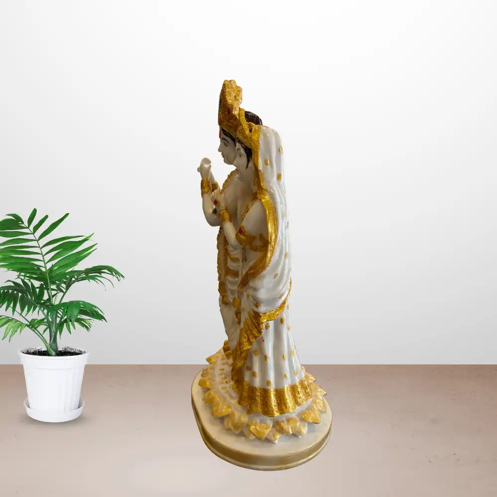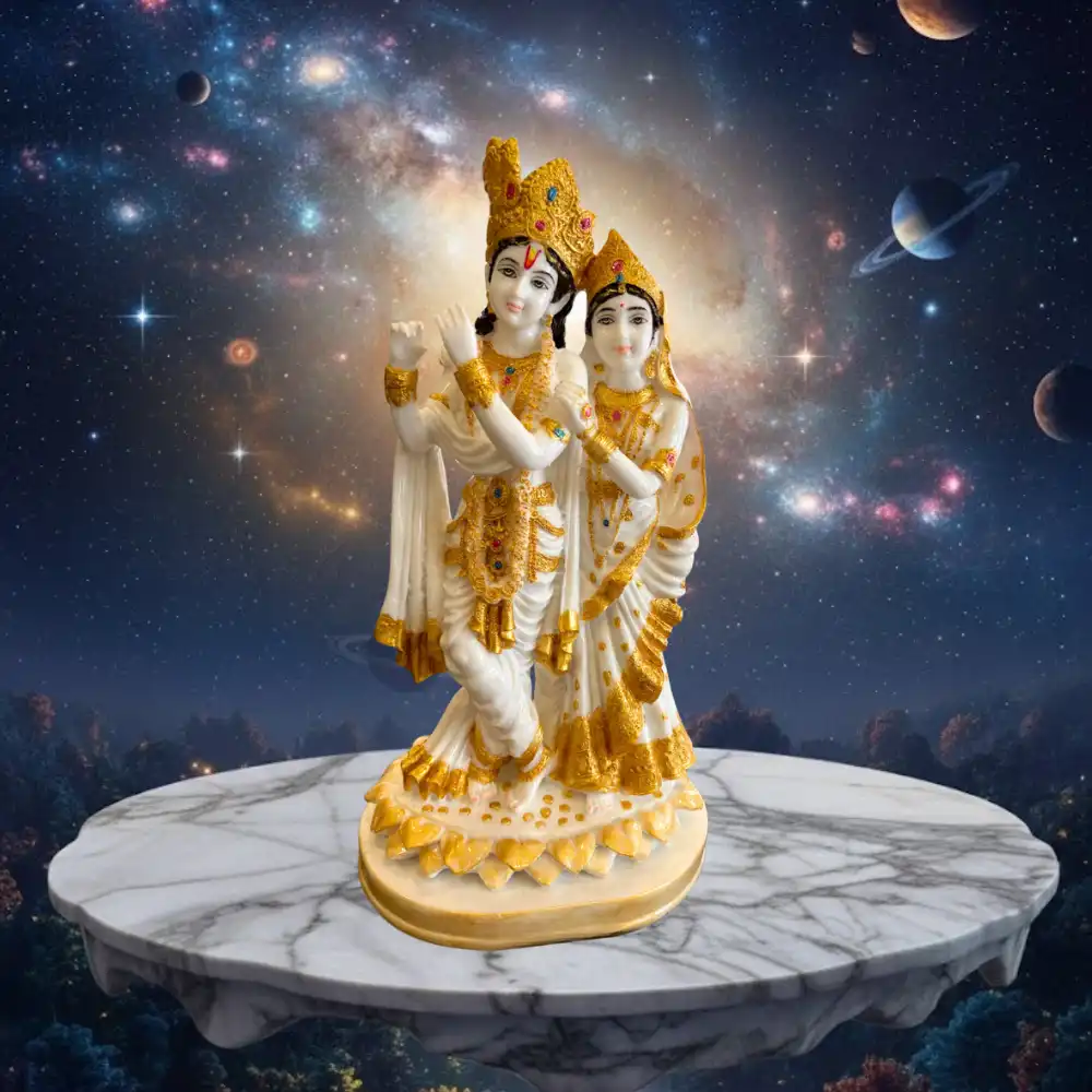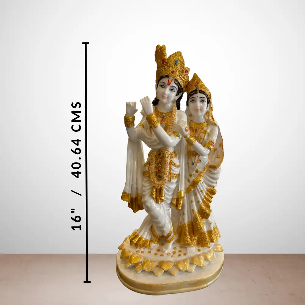 This 16-inch Radha Krishna idol showcases Krishna playing his flute while Radha stands beside him, symbolizing divine love, unity, and spiritual harmony. The intricate detailing, vibrant golden accents, and elegant design make it a timeless piece for both devotional and decorative purposes.