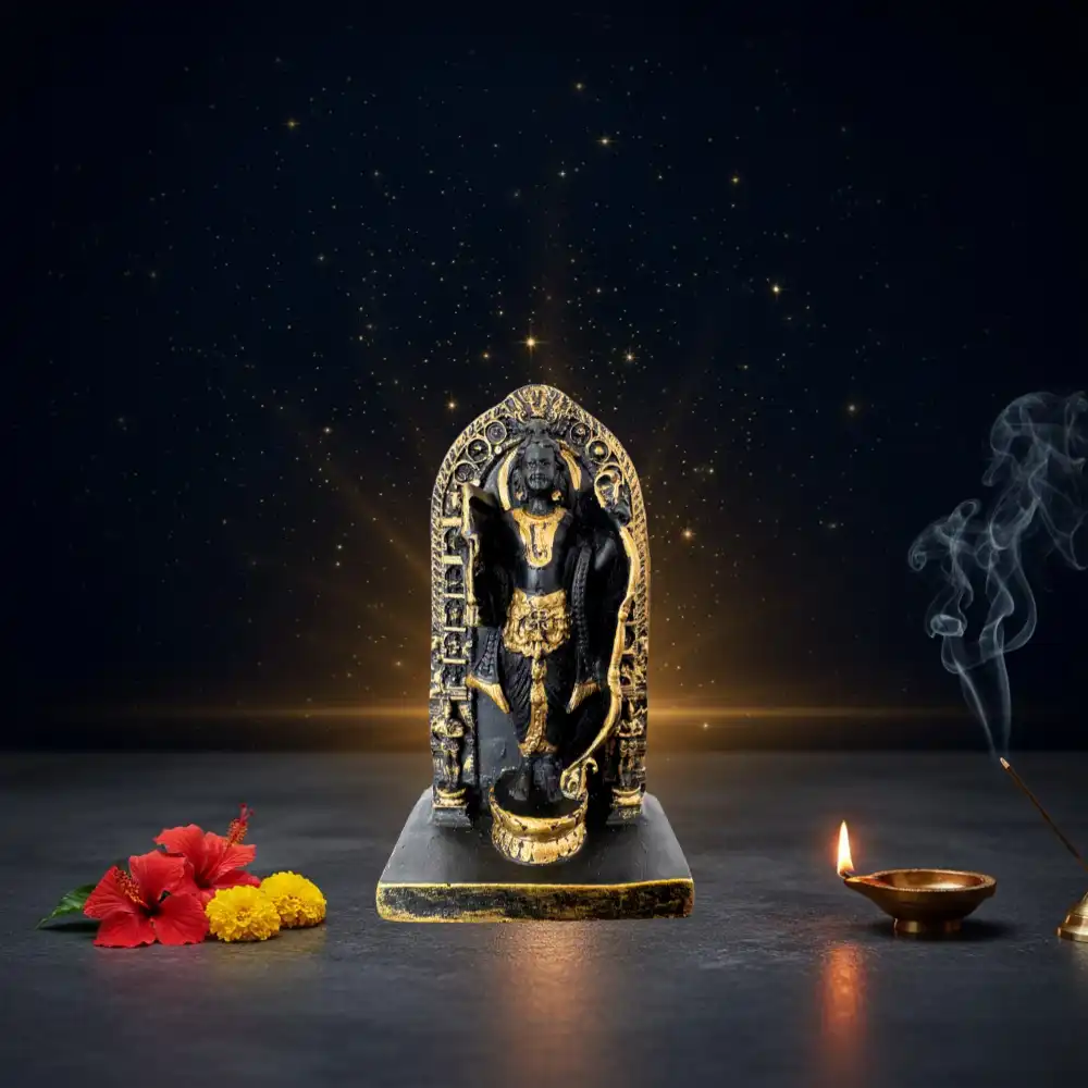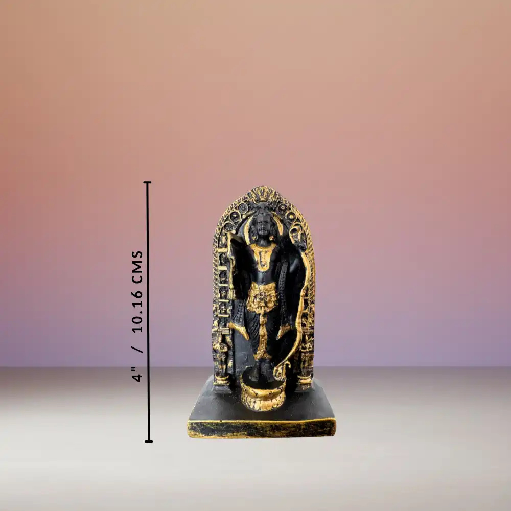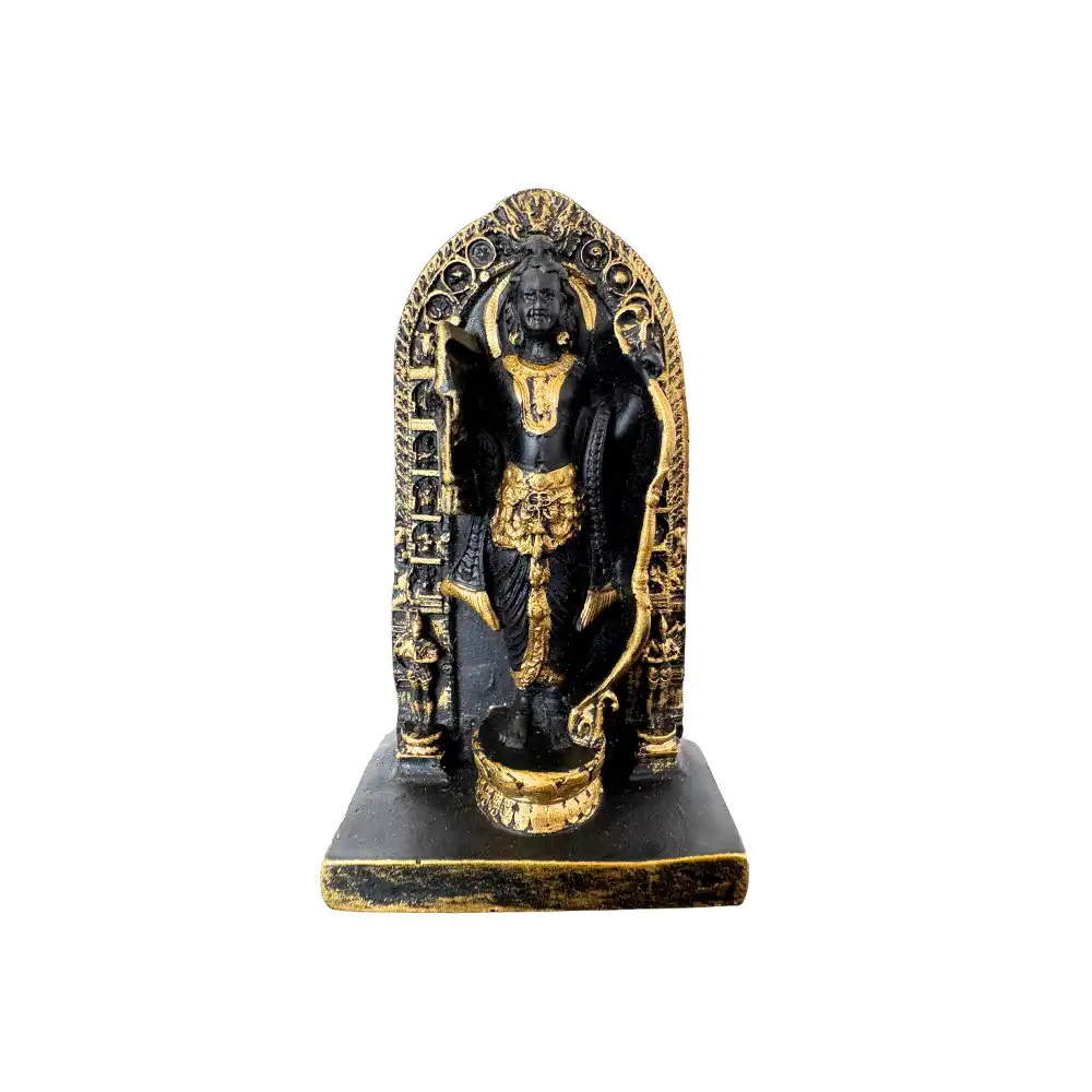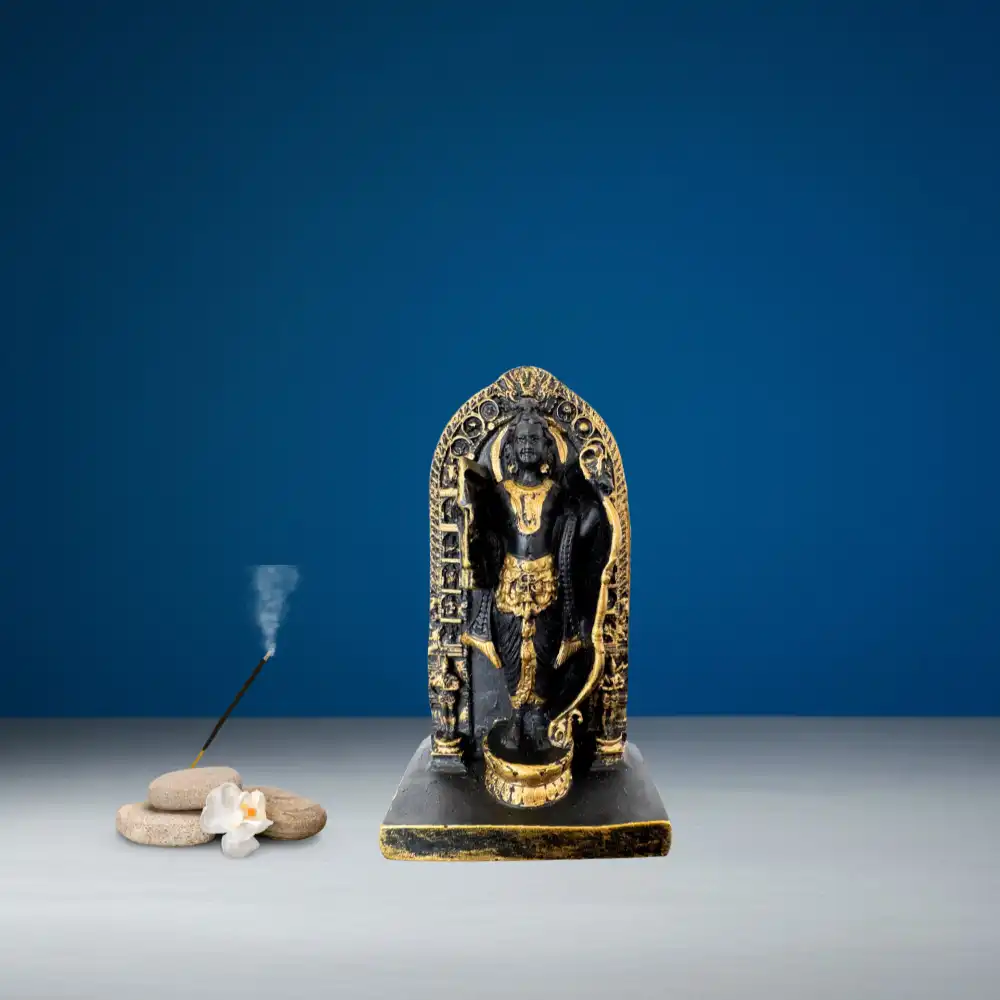 This 4-inch Lord Ram idol beautifully depicts Lord Ram in a standing posture, exuding divine grace and strength. The idol is intricately designed with black and gold detailing, symbolizing righteousness, valor, and devotion. Its compact size and fine craftsmanship make it an ideal piece for spiritual and decorative spaces.