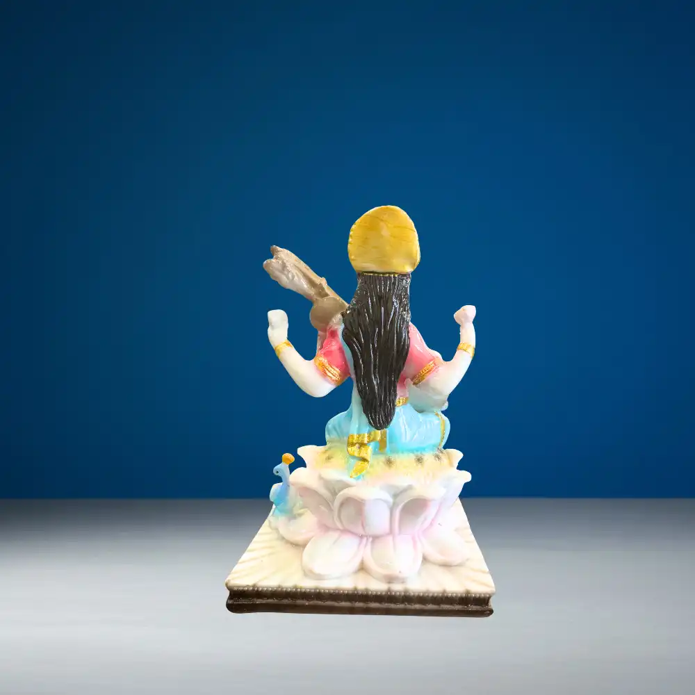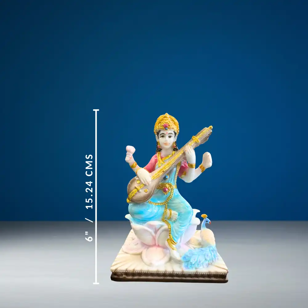 This exquisite 6-inch Saraswati idol depicts the Goddess in a graceful pose, playing the veena, symbolizing knowledge, wisdom, and the arts. Set on a beautiful lotus pedestal, with a peacock beside her, this idol radiates divine elegance and serenity.