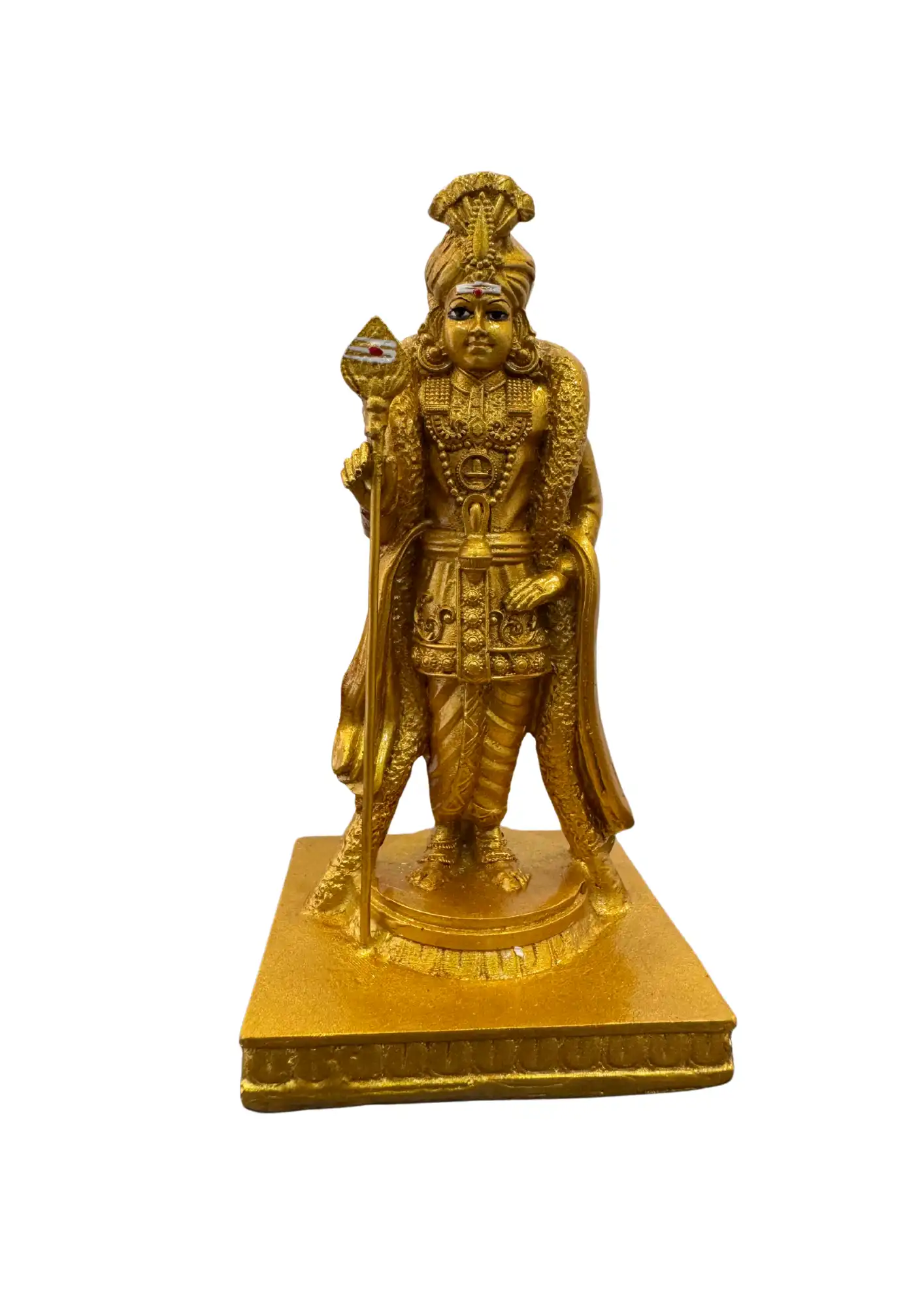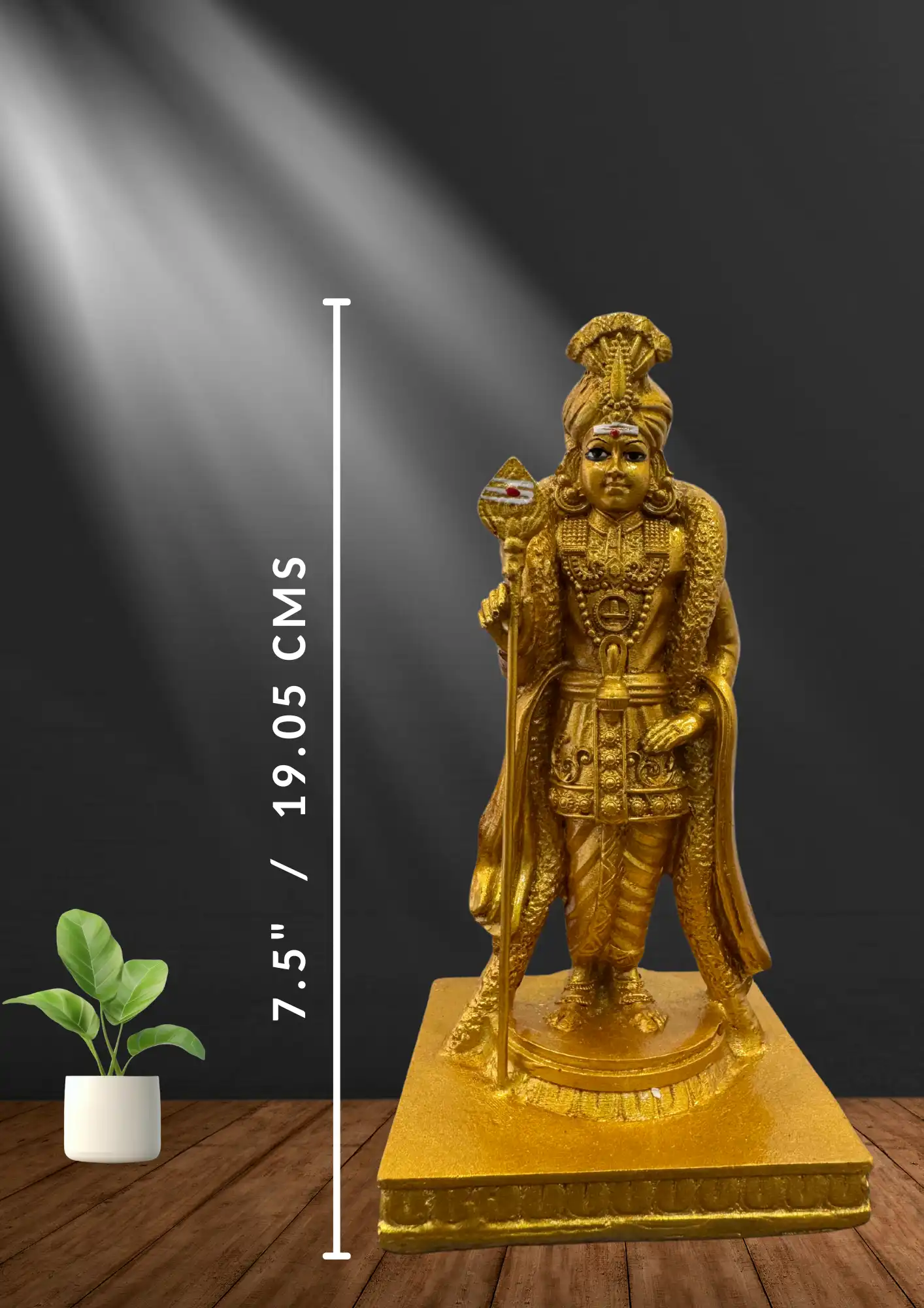 Enhance your home temple and décor with the divine presence of Lord Murugan, the Hindu God of Victory, Courage, and Wisdom. This 7.5-inch Murugan Idol in an elegant golden finish beautifully represents strength and serenity, making it a perfect addition to your spiritual or decorative space.