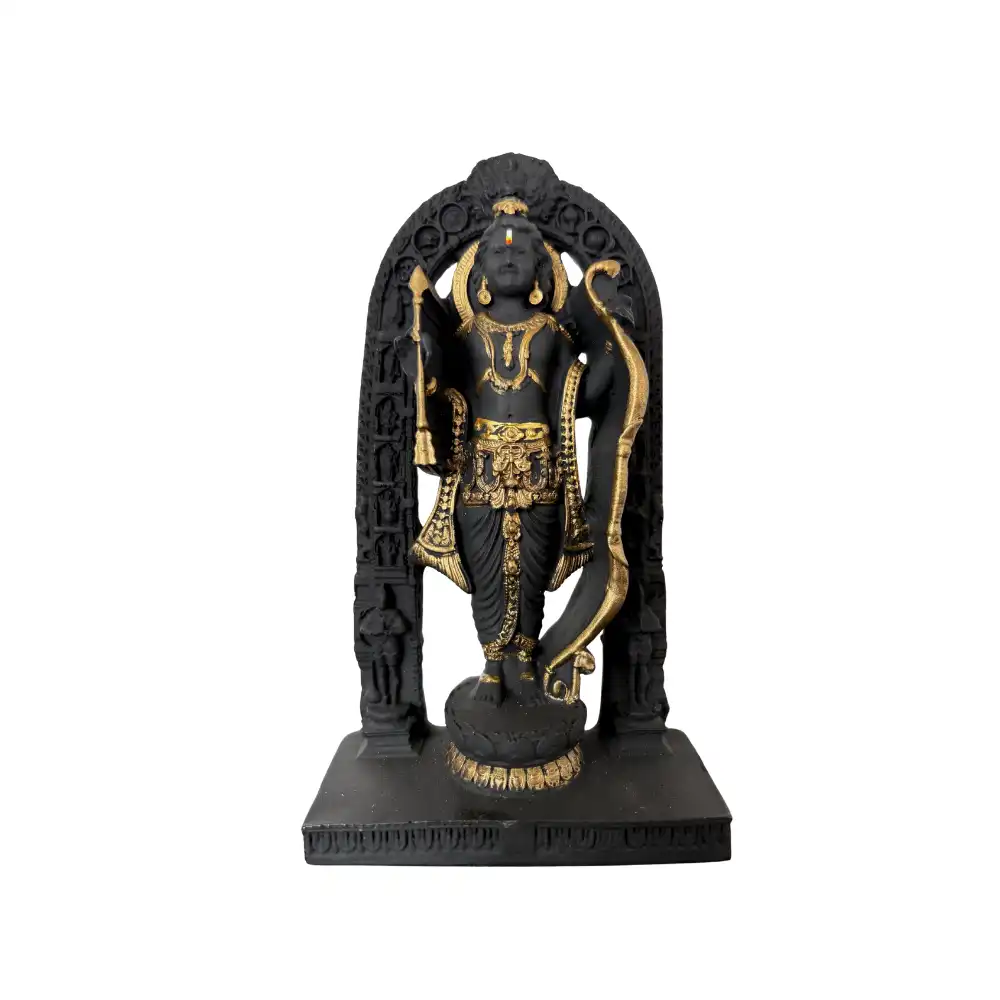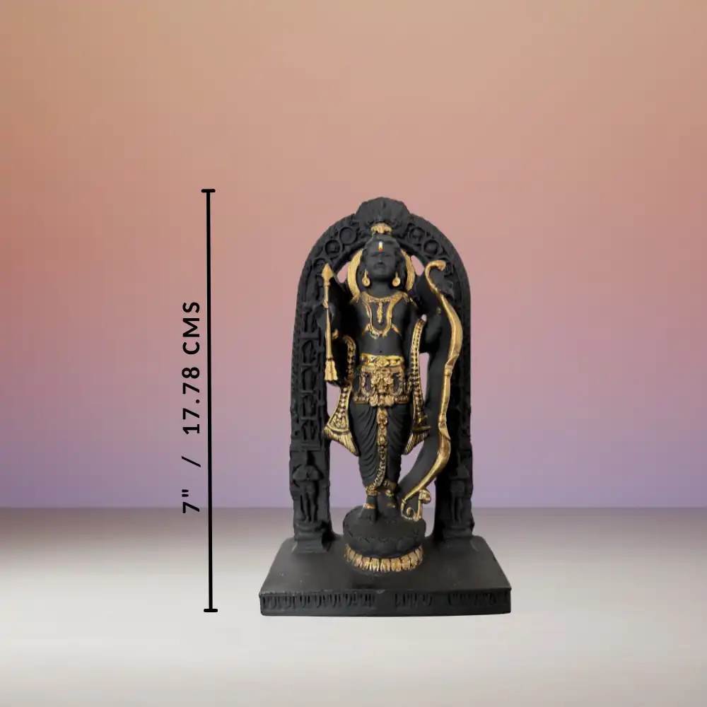 This 7-inch Lord Ram idol beautifully depicts Lord Ram in a poised standing posture, holding his bow in a divine setting. Crafted with intricate black and gold detailing, the idol symbolizes valor, righteousness, and devotion. The detailed archway design adds an extra dimension of elegance, making it a perfect blend of spiritual significance and artistic beauty.