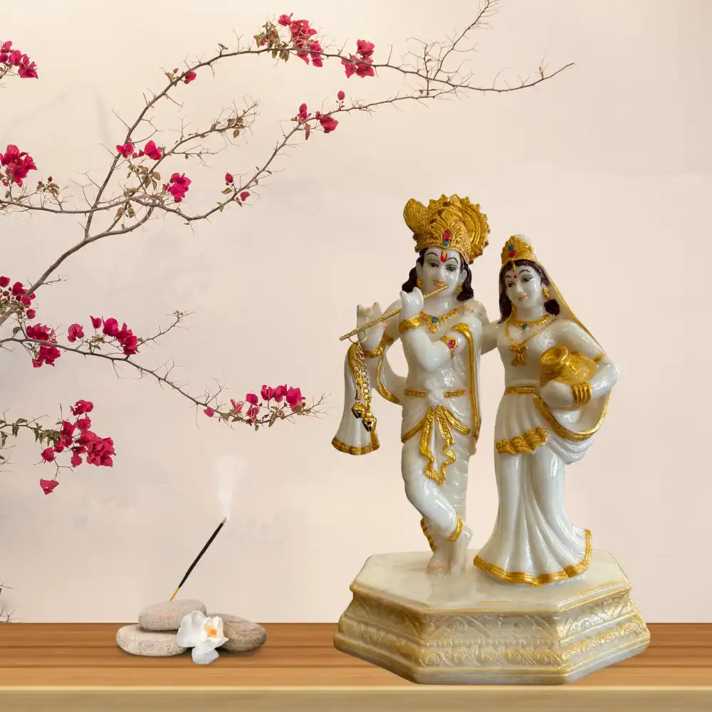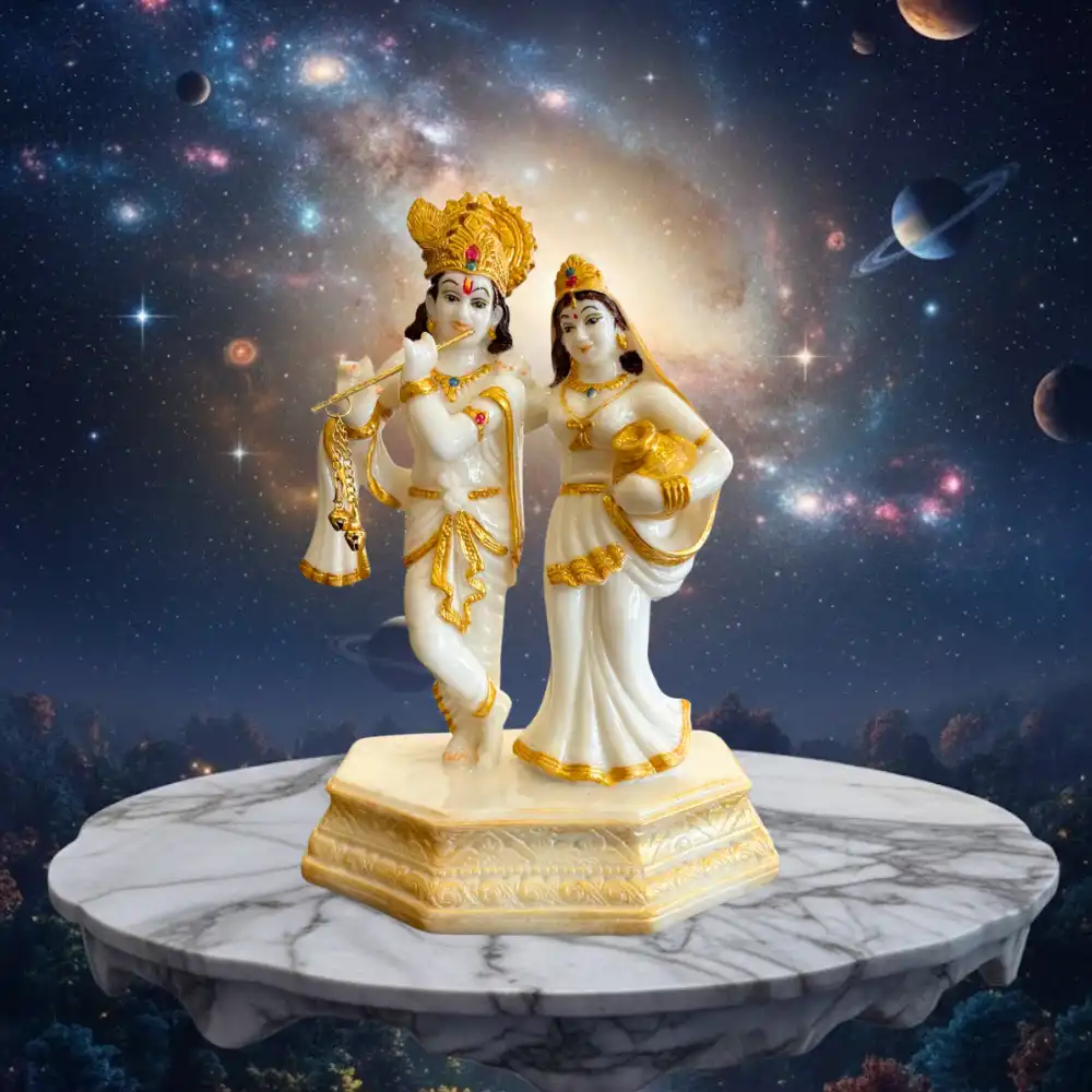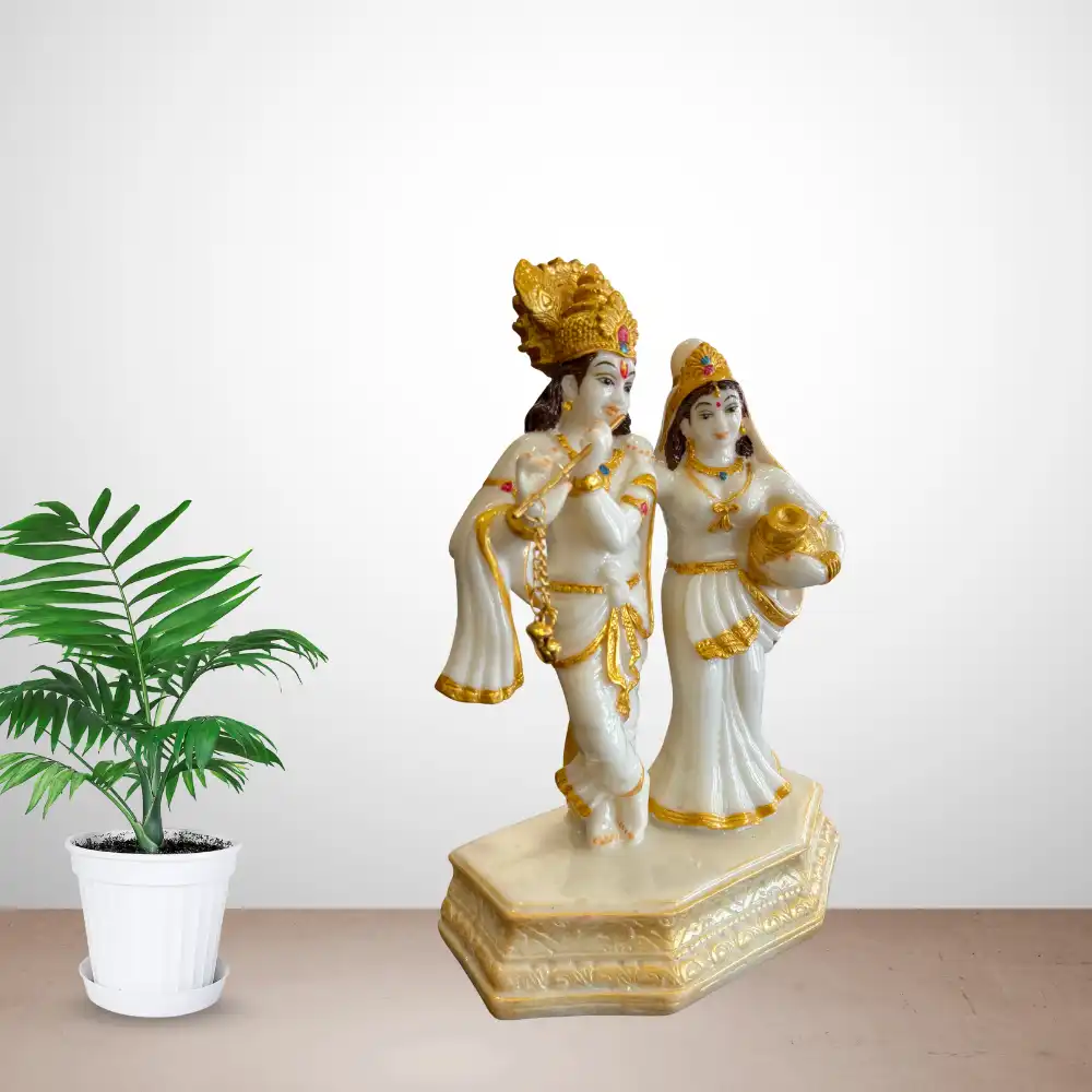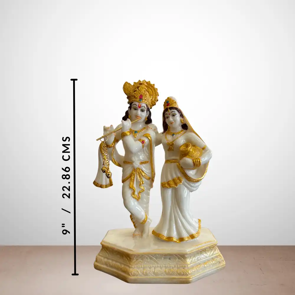 This elegant 9-inch Radha Krishna idol showcases divine grace and harmony, crafted with fine detailing and a smooth finish. The idol portrays Krishna playing the flute with Radha by his side, symbolizing eternal love and positivity.